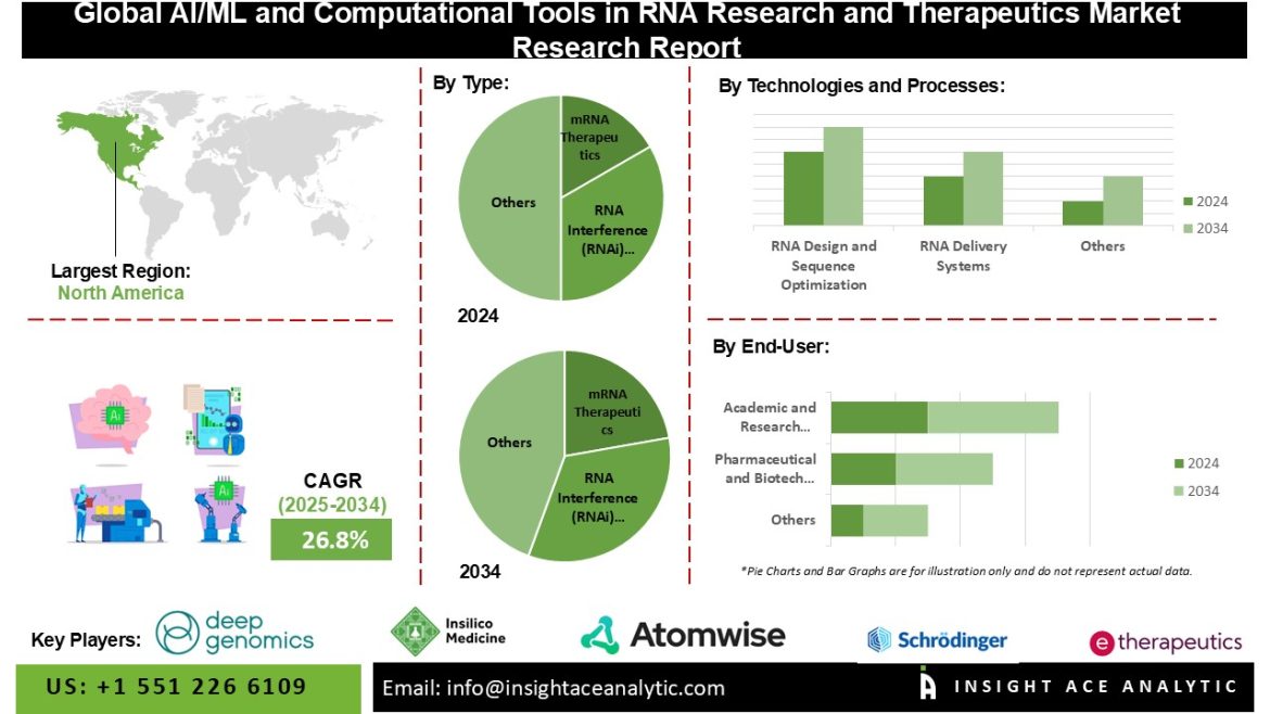 InsightAce Analytic Pvt. Ltd. announces the release of a market assessment report on the “Global AI/ML and Computational Tools in RNA Research and Therapeutics Market Size, Share & Trends Analysis Report By Technologies and Processes (RNA Design and Sequence Optimization, RNA Delivery Systems, RNA Sequencing and Data Analysis, Target Identification and Validation, Preclinical and Clinical Development Tools, Hardware and Infrastructure Support), Product (Vaccines, Drugs), Type (mRNA Therapeutics, RNA Interference (RNAi) Therapeutics, Antisense Oligonucleotide (ASO) Therapeutics, Other Therapeutics), End-User (Pharmaceutical and Biotech Companies, Academic and Research Institutions, Contract Research Organizations (CROs), Healthcare Providers (Emerging))- Market Outlook And Industry Analysis 2034″